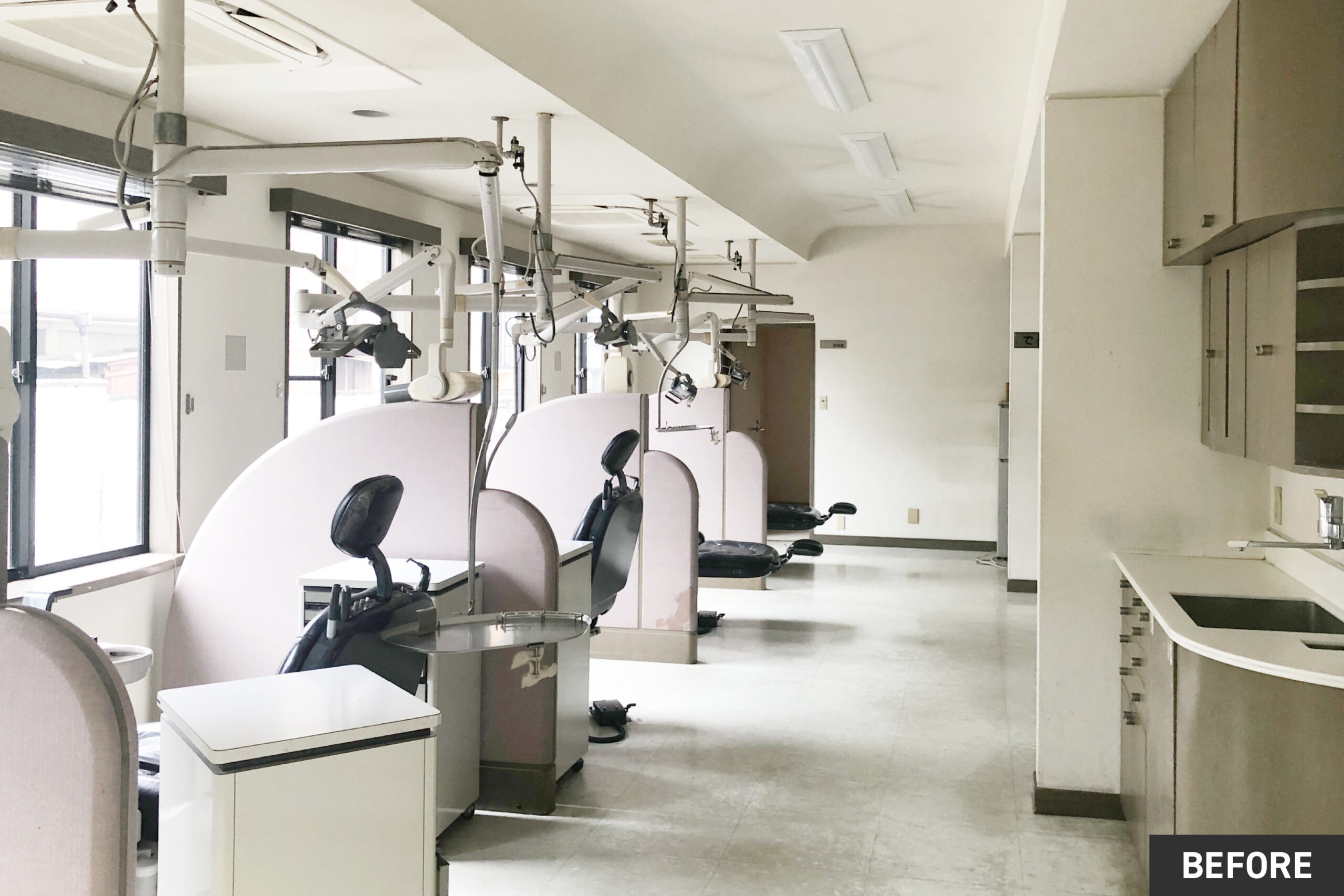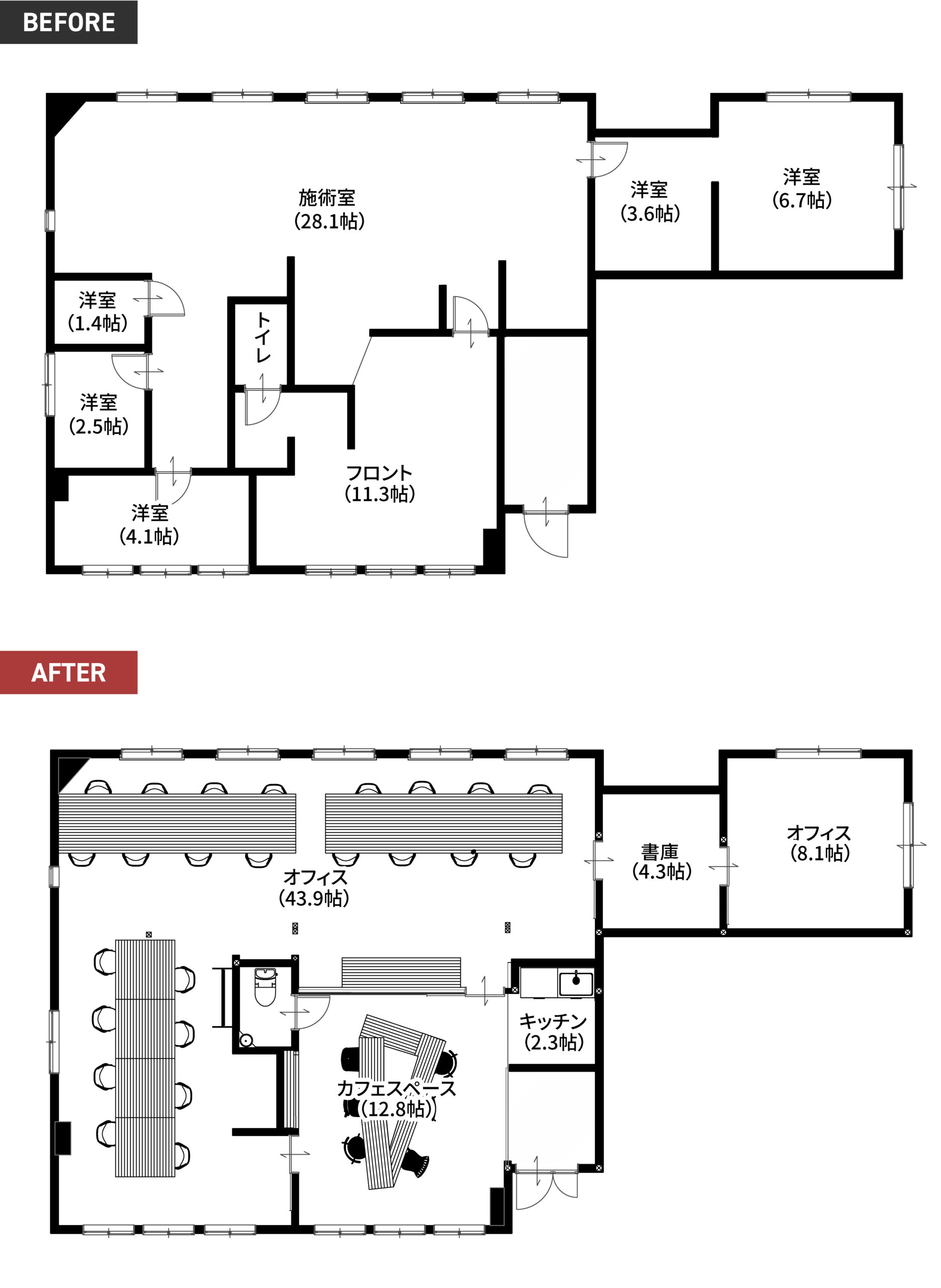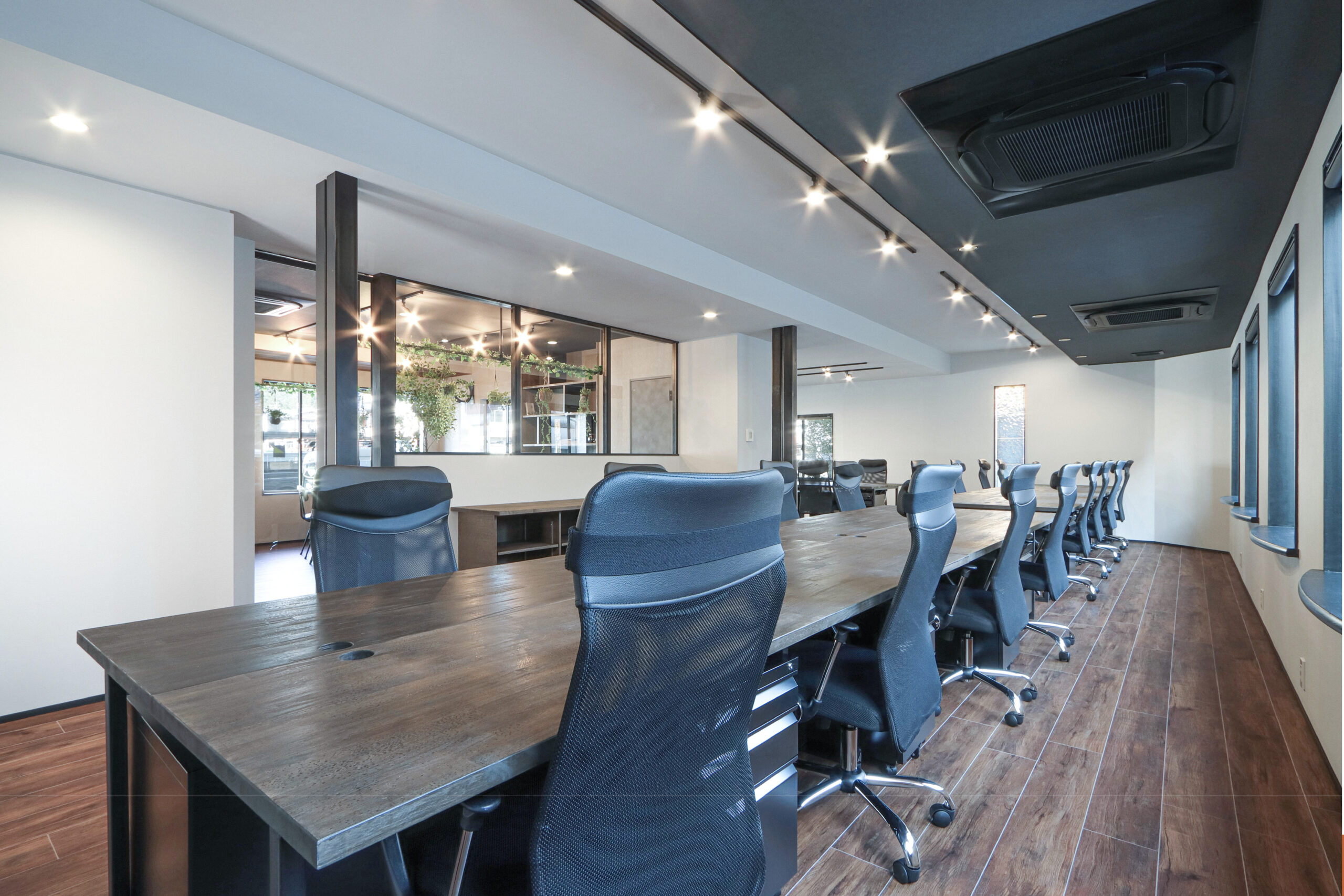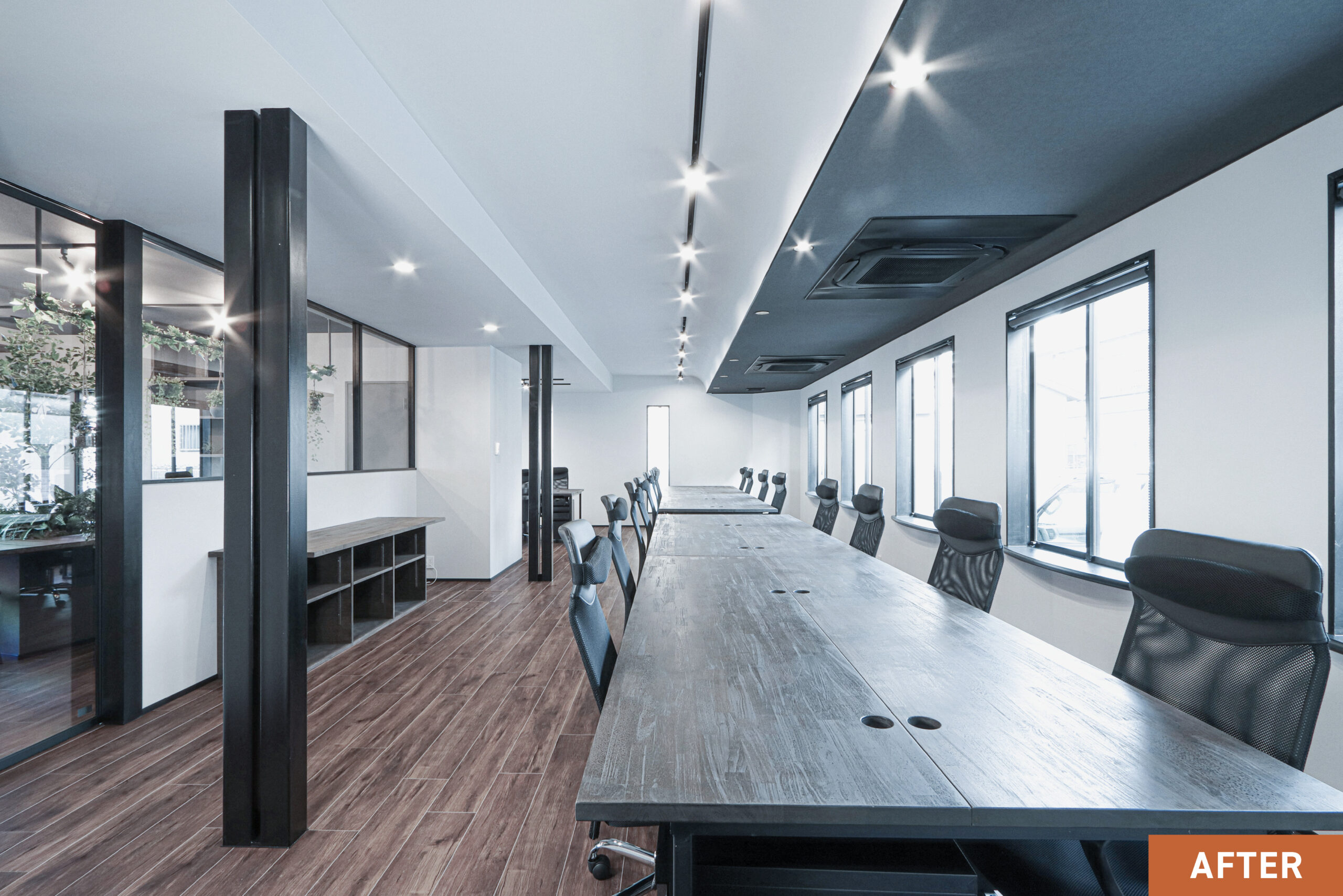 元歯科医院だった建物をオフィスにリノベーションしました。こちらのオフィスは、事務所に入った瞬間の印象を大切にし、入口正面に変形テーブルを配置することで、空間のアイキャッチとなるよう計画しました。室内はガラス間仕切りを採用し、各スペースに広がりを持たせながら、スタッフ同士が自然と顔を見渡せるレイアウトとしました。カフェスペースは天井高をできるだけ確保し、下がり天井との対比によって開放感を演出しています。簡単な打ち合わせができるスペースや、デスク下部に収納を設けることで、日常業務の効率にも配慮しました。入口正面には社名サインとグリーンを配置し、機能性とデザイン性、そしてブランドイメージをバランスよくまとめたオフィス空間になりました。
