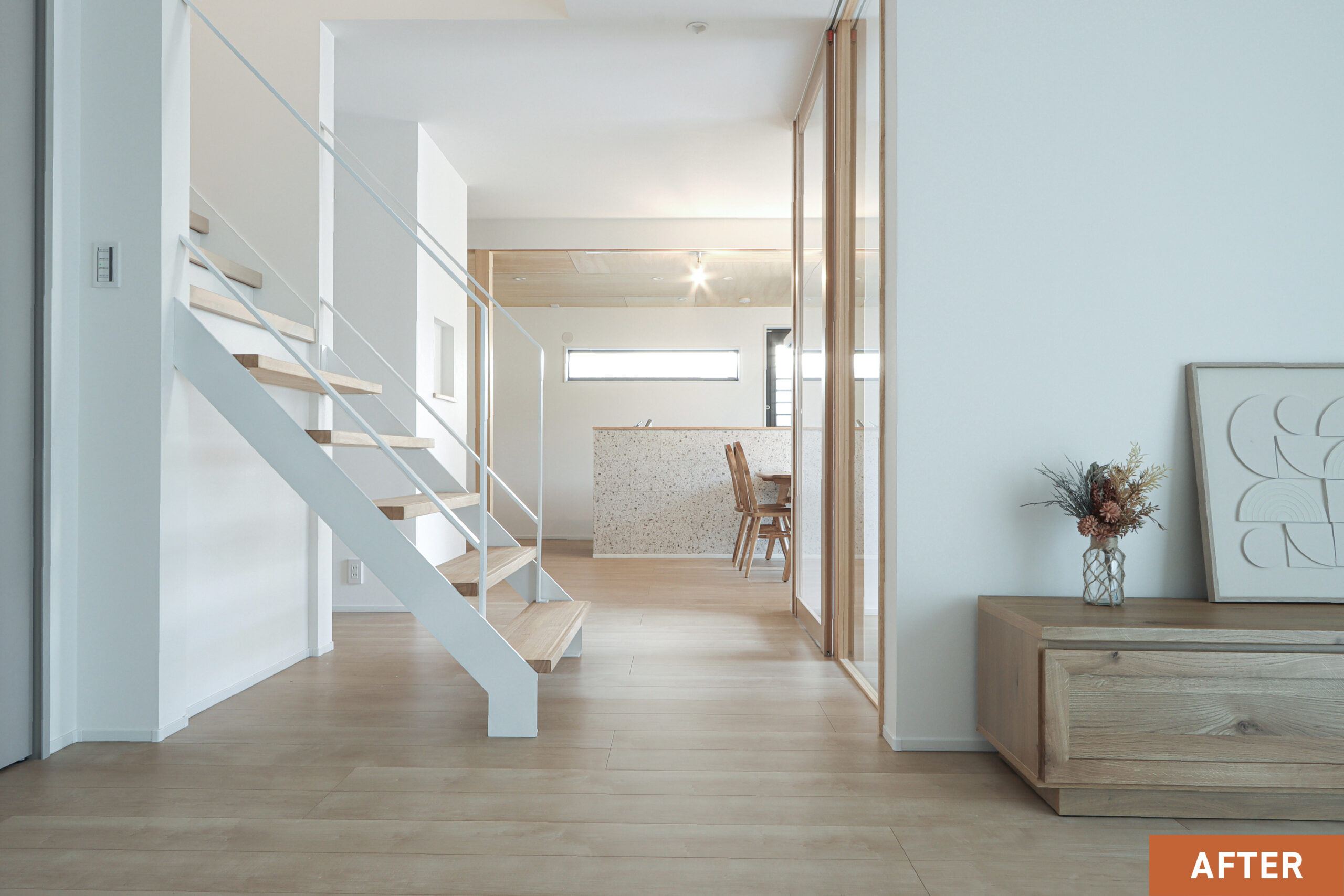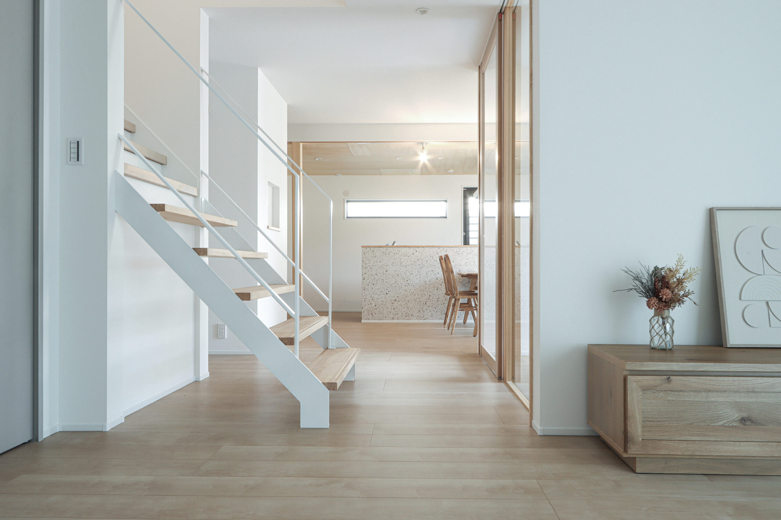 ガラスパーティションや一部ストリップ階段を取り入れ、視線の抜けと空間のつながりを演出しています。