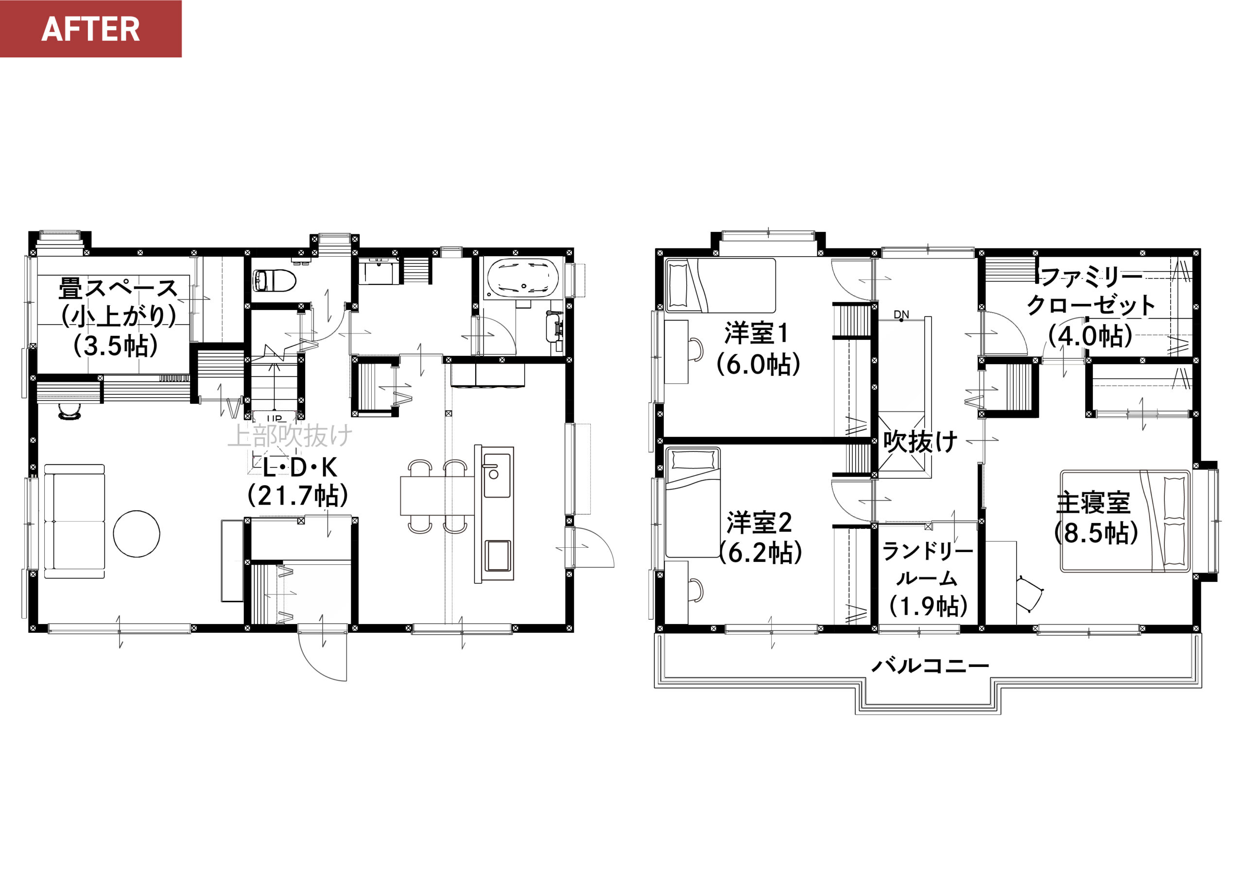 1階は横に広がるLDKを中心に再構成。