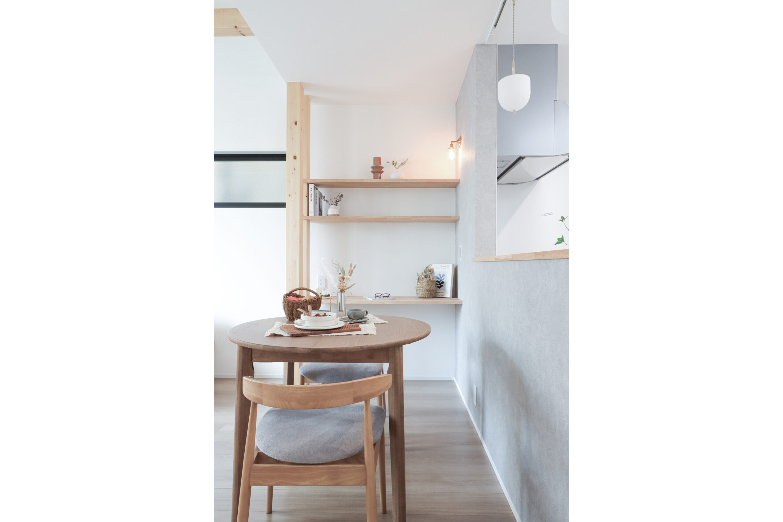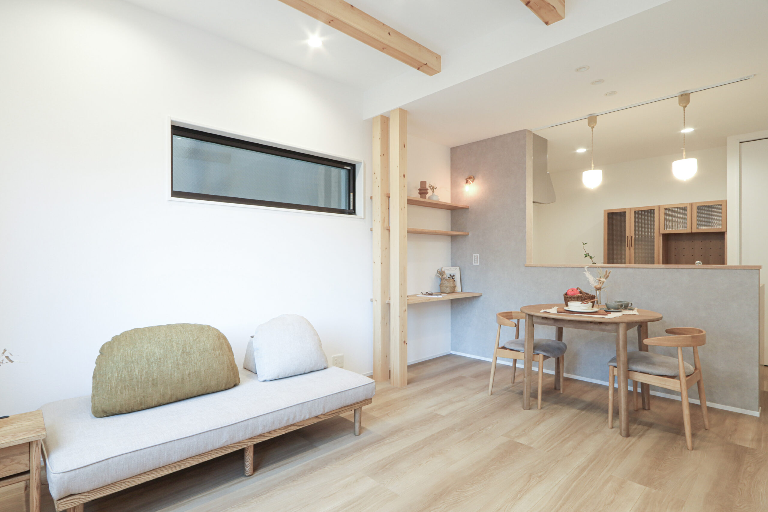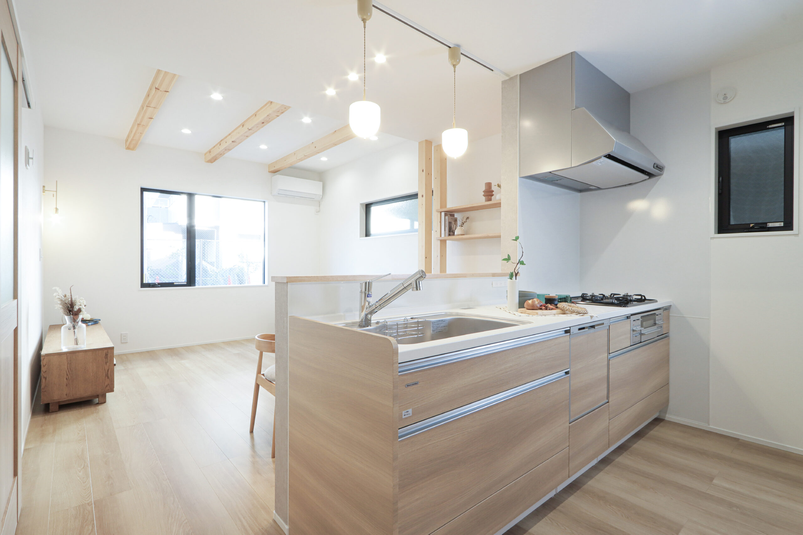 LDKは家族の会話が自然と生まれる配置とし、リビングは高天井に加えて構造材を現したデザインで、開放感あふれる空間に。ダイニング横には造作カウンターを設け、お子様の宿題やお絵かきを見守れるスタディースペースを確保しました。